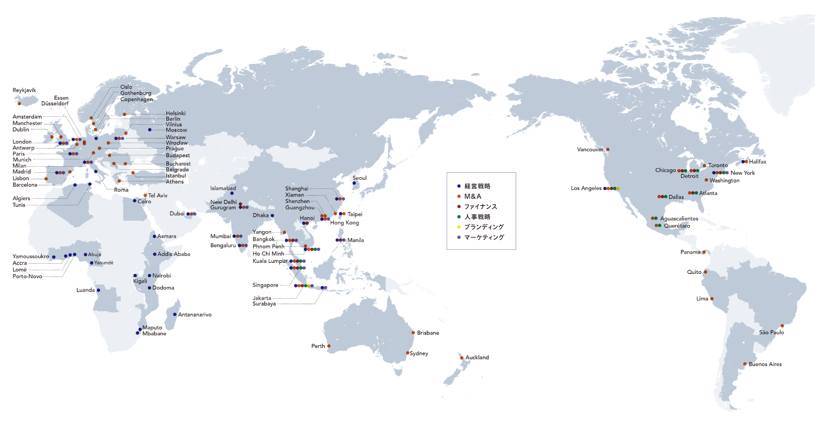 創業以来、台湾(1969年)を皮切りにアジアを中心とした事業の進出、業務提携を実施してきました。そして、上海(2006年)にも進出し、現地の情報収集、ノウハウを蓄積してきましたが、事業進出の失敗を経験し、全て解散・撤退しています。現在は、経営コンサルティング領域の拡大を推進しており、国内外のネットワークと専門的な知見を持つグループ企業の力を結集し、グローバルビジネスの進出、再編、撤退といったトータルサポートが可能となっております。また私たちの経営理念には「常にパイオニアとして世界への道を拓く」という一文があります。「世界への道を拓き」クライアントともに「世界を変えていく」活動を通じて、グローバルファームにチャレンジしてまいります。