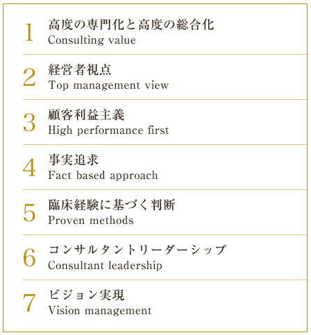 経営診断からチームコンサルティングへのメソッドが確立した2016年には「チームコンサルティングブランディングブック」を製作。その中で「チームコンサルティング7つの約束」をまとめた。これがタナベコンサルティンググループのクオリティー基準となっている。